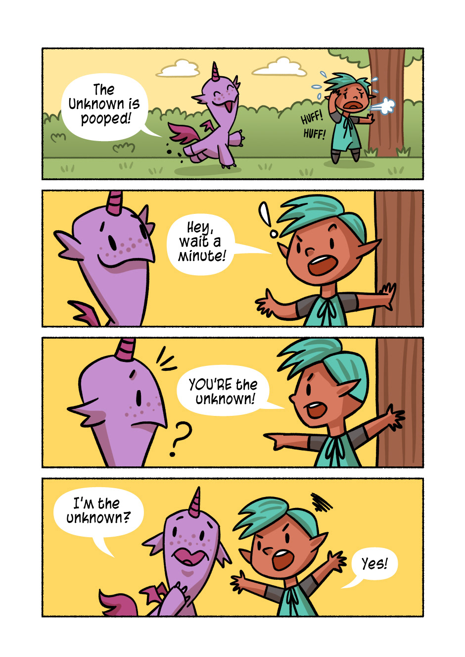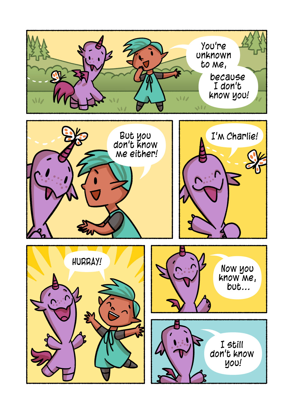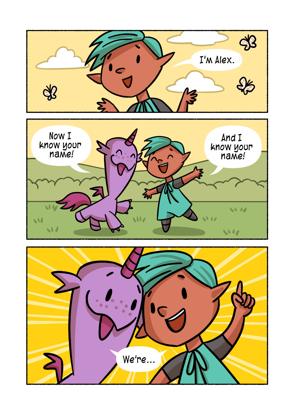 Alex & Charlie was a pitch for a junior graphic novel. It featured friends Alex (an elf) and Charlie (a dragon-unicorn). The script was written by Wayne Santos.