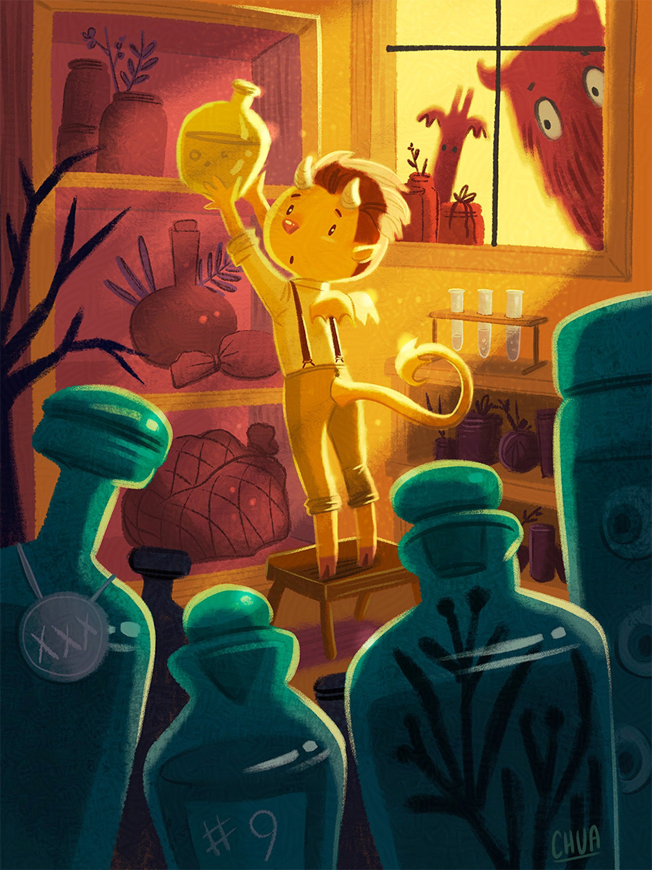 Little devil-kin apprentice putting up a jug on the shelf while some monsters peek in for a look