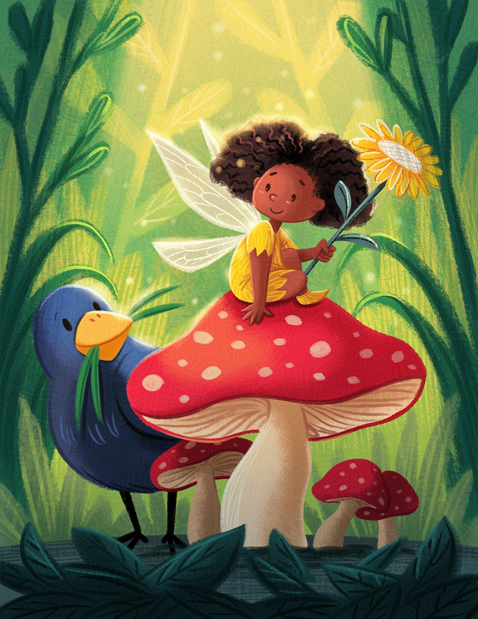 Illustration of a little fairy holding a flower, sitting on a red mushroom. A friendly bird with grass in its mouth looks at her.