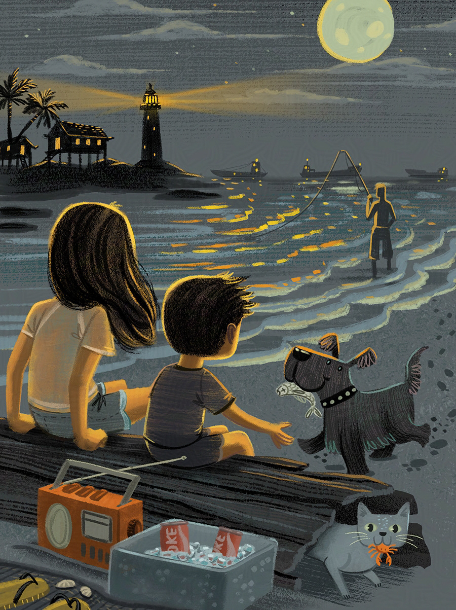 Two children on a tropical beach at night. A memory of various night beaches I saw when I was a child growing up in Singapore.