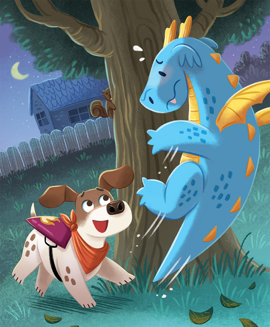 Art from Hocus & Pocus book 2. Pocus (the puppy) meets Bye Bye the blue dragon.