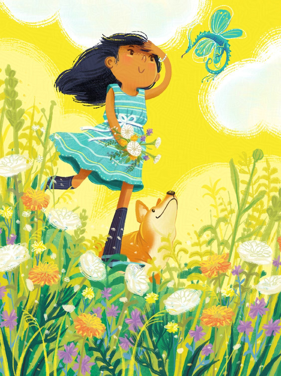 Girl holding flowers in a summer meadow with her dog and a tiny dragon.
