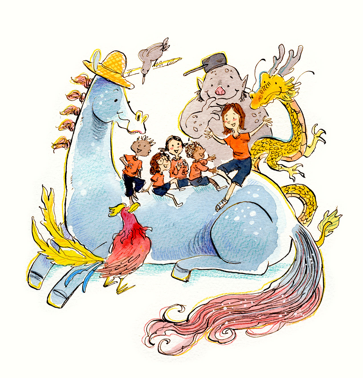 Pen and ink, watercolor and color pencil