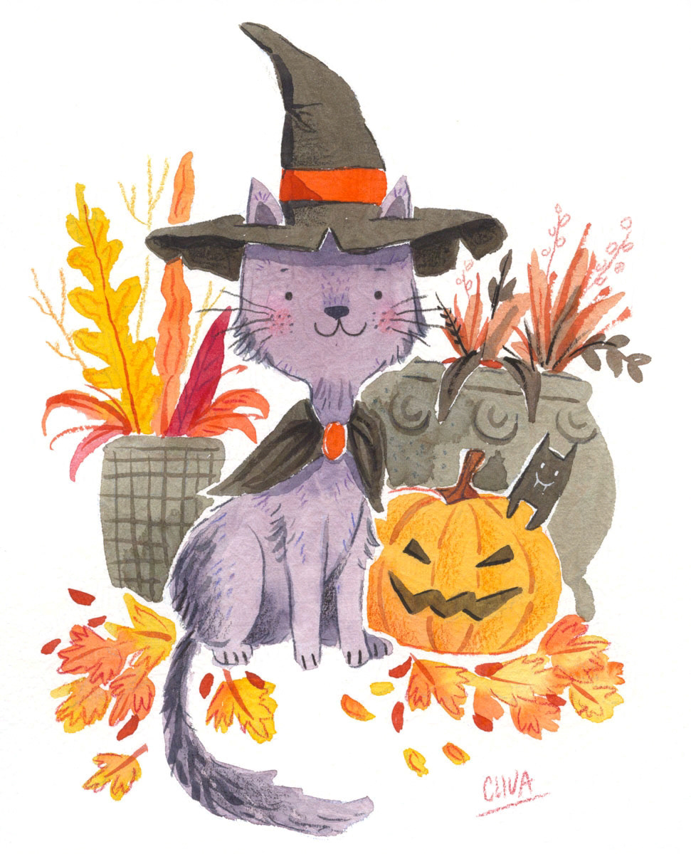 A purple cat wearing a witch's hat and cape. Behind it are Halloween decorations. Watercolor and color pencil on hotpress.
